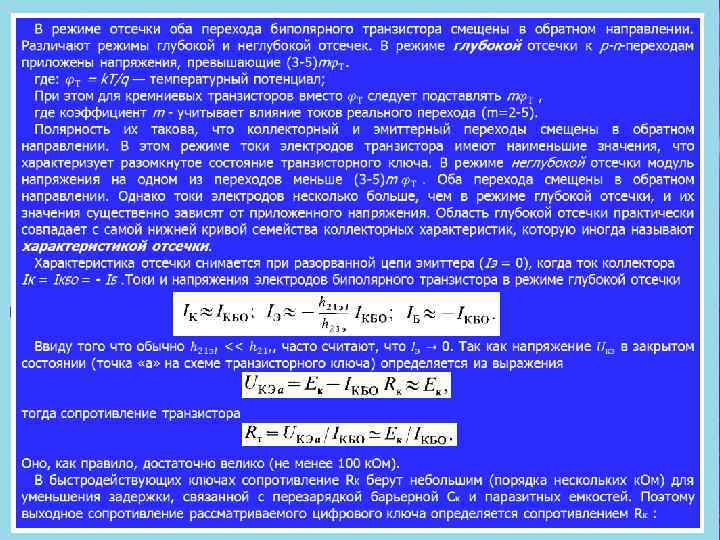 Для количественной оценки глубины насыщения вводят параметр степень насыщения. Степень насыщения определяется как относительное превышение базовым током IБ того значения тока Iбнас , которое характерно для границы насыщения: Иногда оценку глубины насыщения производят с помощью коэффициента насыщения, который показывает, во сколько раз ток, протекающий в цепи базы, больше базового тока, при котором транзистор входит в насыщение: При насыщении сопротивление транзистора минимально и практически не зависит от значений IБ и RK. Оно и является выходным сопротивлением транзисторного ключа в стационарном замкнутом состоянии. С увеличением базового тока напряжение на эмиттерном переходе UБЭ меняется мало. Напряжение на коллекторном переходе и модуль напряжения UКЭнас уменьшаются. Значение UКЭнас зависит от типа транзисторов и обычно находится в пределах 0, 08— 1 В. При изменении температуры окружающей среды напряжения UKБ и UЭБ изменяются приблизительно так же, как и в диодах. В то же время напряжение UКЭнас, являющееся разностью этих двух напряжений, изменяется мало. Температурный ко эффициент напряжения (ТКН) ключа обычно порядка 0, 15 м. В/град. Следует подчеркнуть, что начиная от значений степени насыщения N=3 5 и выше межэлектродные напряжения транзистора мало зависят от тока базы. Поэтому более высокую степень насыщения применять нецелесообразно. Важным преимуществом режима насыщения является прак тическая независимость тока коллектора от температуры окружающей среды и параметров конкретного транзистора. Входную цепь транзисторного ключа характеризуют сле дующие параметры: 1) входной ток закрытого транзистора; 2) напряжение управления, необходимое для надежного за пирания транзистора; 3) минимальный перепад управляющего сигнала, необходимый для обеспечения надежного отпирания транзистора;