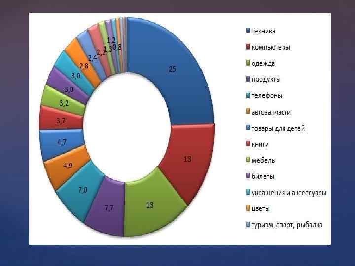 В России на долю онлайн-продаж приходится 1, 6 % от общего объема продаж всей российской розницы (в среднем по ЕС этот показатель составляет 5, 7 %, а в США — 6, 4 %). По отдельным товарным группам картина несколько иная. В частности, через Интернет продаётся, около 12 -14 % бытовой техники, электроники и книг. На 2011 год в России насчитывалось порядка 30 000 интернетмагазинов. По статистике, за год в России закрывается порядка 10% интернет-магазинов, но вместо них открывается 20 -30% новых. Сам рынок электронной коммерции в РФ прогнозирует свой рост в 2 раза за ближайшие четыре года.