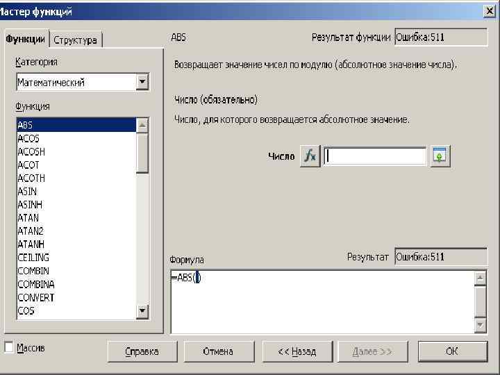 Основные функции. Название Назначение Действие 1. Математические – 50 штук 1. ЦЕЛОЕ Определяет целую часть числа =ЦЕЛОЕ(412, 98) 2. СЛЧИС Определяет случайное число из [0, 1) =ЦЕЛОЕ(6*СЛЧИС()+1) – опр. случайное число от 1 до 6 3. РИМСКОЕ Преобразует число римское =РИМСКОЕ(1998) – MCMXCVIII 4. ОКРУГЛ Округляет значение до указанного количества десятичных разрядов =ОКРУГЛ(123, 456; 2) – 123, 46 =ОКРУГЛ(123, 456; 1) – 123, 50 =ОКРУГЛ(123, 456; -2) – 100, 00 5. ПИ Число – 14 знаков 6. SIN Sin угла в радианах 7. КОРЕНЬ Квадратный корень Кубический корень – ^1/3 =КОРЕНЬ (А 4+В 4) 8. СУММ Вычисляет сумму – до 30 аргументов кнопка < > =СУММ(А 1: А 7; В 1: В 7; Е 7; С 12) – 412
