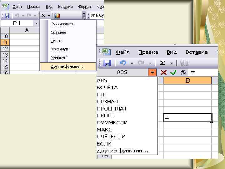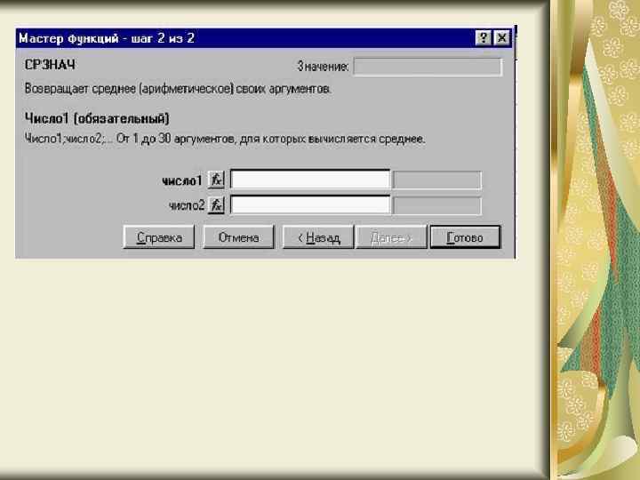Для розрахунку середнього значення чисел, розміщених у десяти клітинках (А 1: А 10), використана така формула: =(А 1+А 2+А 3+А 4+А 5+А 6+А 7+А 8+А 9+А 10)/ 10 Краще замінити цю формулу на одну, дуже просту в користуванні, вбудовану функцію робочої таблиці Excel: =СРЗНАЧ(А 1: А 10) або = AVERAGE(А 1: А 10)