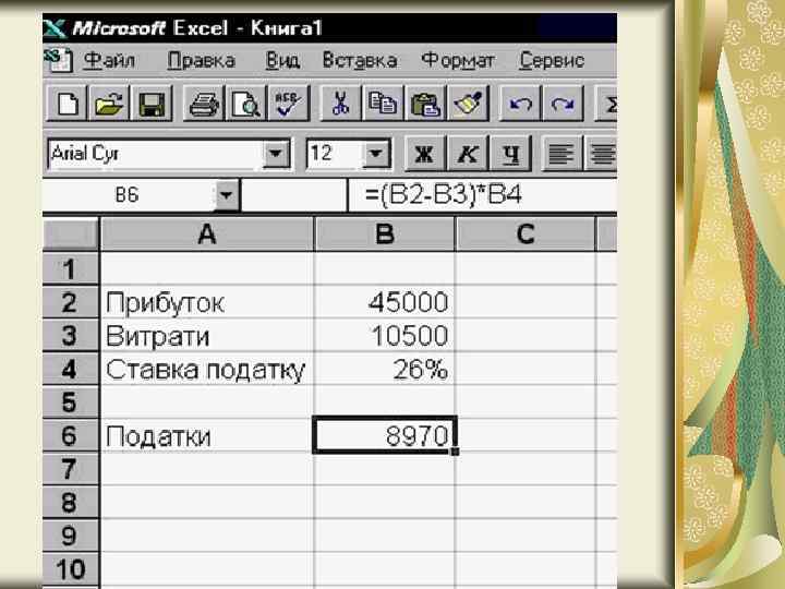 У цьому випадку формула віднімає число, розміщене в клітинці В 3, від числа, розміщеного в клітинці В 4. Якби користувач присвоїв цим клітинкам імена, то формула б більш наочною. Ось як трансформується ця формула після присвоєння імен: =(Прибуток-Витрати)*Ставка. Податку