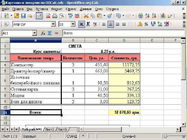 Рядок меню Поле імені Панели инструментов Стандартная и Форматирования Строка Формул Заголовок стовпців Поточна клітинка Заголовок рядків Примітка Панель ярликів