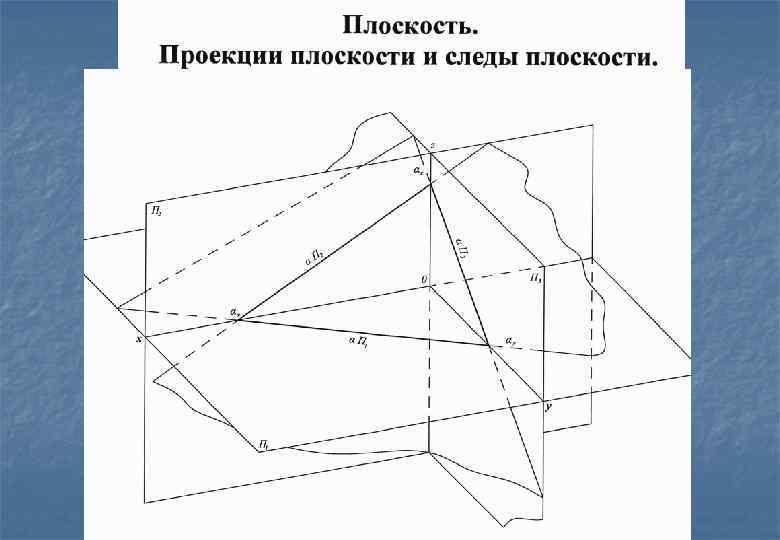 Следы плоскости общего положения. ан -горизонтальный след плоскости а; аvфронтальный след плоскости; аw- профильный след плоскости; ax, ay , az- точки схода следов.