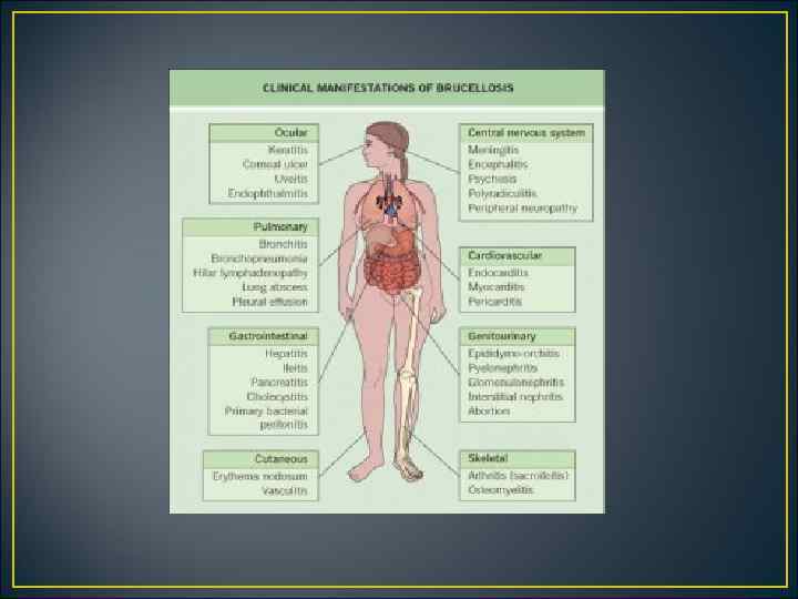 КЛИНИКА: УНДУЛИРУЮЩАЯ (волнообразная) ЛИХОРАДКА (ЧИСЛО ВОЛН ДО 15 И БОЛЕЕ) • ПОСТЕПЕННЫЙ ПОДЪЕМ ТЕМПЕРАТУРЫ ДО 38 39 С • потливость, увеличение л/у, печени, селезенки, боли в мышцах, суставах, в пояснице, тазовых костях, по ходу седалищного нерва • заболевание протекает в виде ТИПИЧНОЙ ХРОН. РЕЦИДИВИРУЮЩЕЙ ИНФЕКЦИИ И БЕССИМПТОМНО.