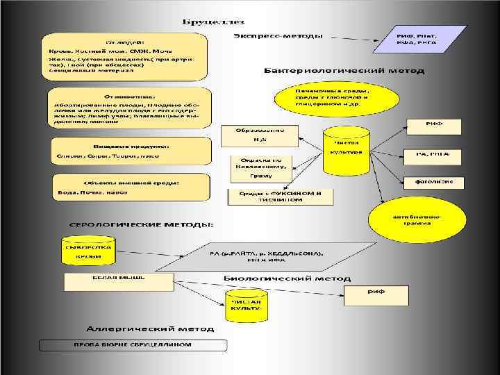 Принципы лабораторной диагностики бруцеллеза: диагностики бруцеллеза 1. Обнаружение возбудителя и его Аг 2. Специфических Ат 3. Сенсибилизации организма к бруцеллезным Аг 4. Выявление специфических изменений в организме Основные методы лабораторной диагностики: 1. Бактериологический (выделение гемо , урино , копрокультур) 2. Серологический 3. Биологический 4. Аллергический