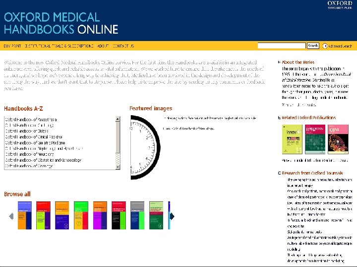 Справочники: Oxford Reference Online, Oxford Handbooks Online, Oxford Digital Reference Shelf Электронные книги: Oxford Scholarship Online Языковые словари: Oxford English Dictionary, Oxford Language Dictionaries Online (двуязычные, 6 языков среди которых Английский – Русский - Английский) Специализированные базы данных: Право: Oxford Reports of International Law, Max-Planck Encyclopedia of Public International Law, Investment Claims, Oceana Constitutions of the Countries of the World Медицина: Oxford Medical Handbooks Online, AMA Manual of Style, ESC Textbook of Cardiology (launching July 09), Oxford Textbook of Medicine (launching December 09)
