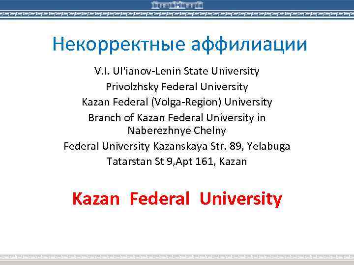 Некорректные аффилиации V. I. Ul'ianov-Lenin State University Privolzhsky Federal University Kazan Federal (Volga-Region) University Branch of Kazan Federal University in Naberezhnye Chelny Federal University Kazanskaya Str. 89, Yelabuga Tatarstan St 9, Apt 161, Kazan Federal University