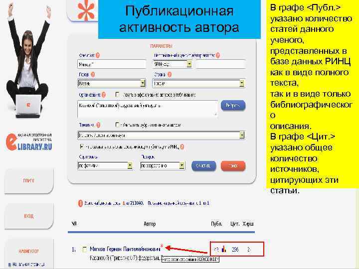 Публикационная активность автора В графе <Публ. > указано количество статей данного ученого, представленных в базе данных РИНЦ как в виде полного текста, так и в виде только библиографическог о описания. В графе <Цит. > указано общее количество источников, цитирующих эти статьи.