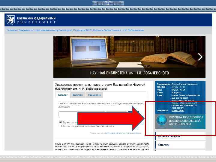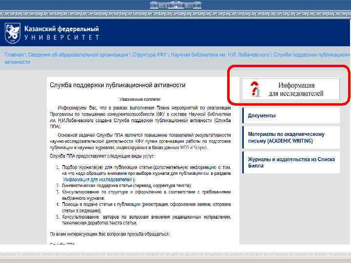 Служба ППА предоставляет следующие виды услуг: ü Подбор журнала для публикации ü Лингвистическая поддержка статьи (перевод, корректура текста) ü Консультирование по структуре и оформлению в соответствии с требованиями выбранного журнала ü Помощь в подаче статьи к публикации (регистрация, оформление заявки, отправка статьи в редакцию) ü Консультирование авторов по вопросам внесения редакционных исправлений, техническая доработка текста статьи. Куда обращаться? Научная библиотека им. Н. И. Лобачевского, ул. Кремлевская, 35 Цокольный этаж, ком. 2 Тел. : (843)233 -75 -28 E-mail: sppa@kpfu. ru
