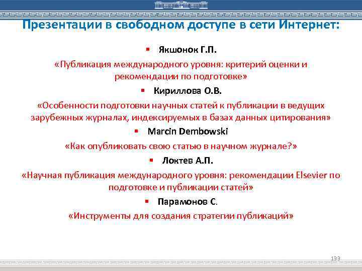 Презентации в свободном доступе в сети Интернет: § Якшонок Г. П. «Публикация международного уровня: критерий оценки и рекомендации по подготовке» § Кириллова О. В. «Особенности подготовки научных статей к публикации в ведущих зарубежных журналах, индексируемых в базах данных цитирования» § Marcin Dembowski «Как опубликовать свою статью в научном журнале? » § Локтев А. П. «Научная публикация международного уровня: рекомендации Elsevier по подготовке и публикации статей» § Парамонов С. «Инструменты для создания стратегии публикаций» 133