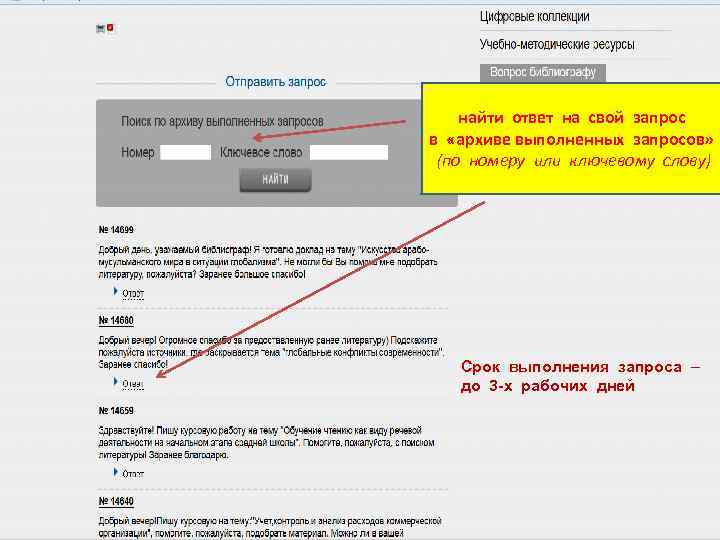найти ответ на свой запрос в «архиве выполненных запросов» (по номеру или ключевому слову) Срок выполнения запроса – до 3 -х рабочих дней