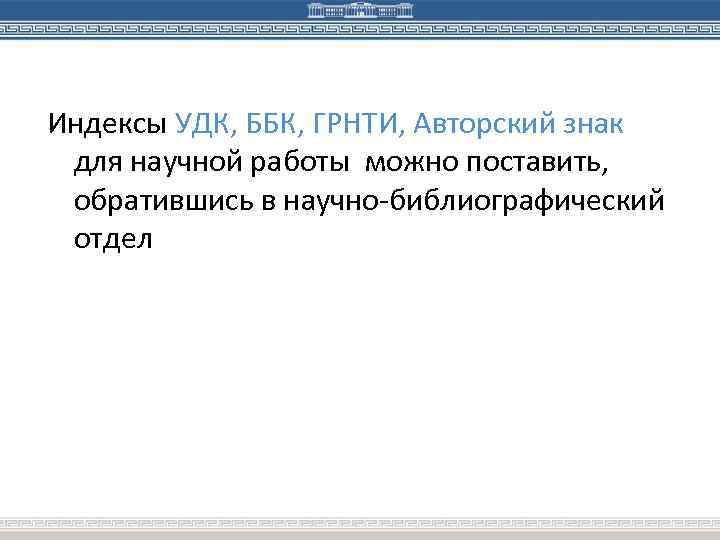 Индексы УДК, ББК, ГРНТИ, Авторский знак для научной работы можно поставить, обратившись в научно-библиографический отдел