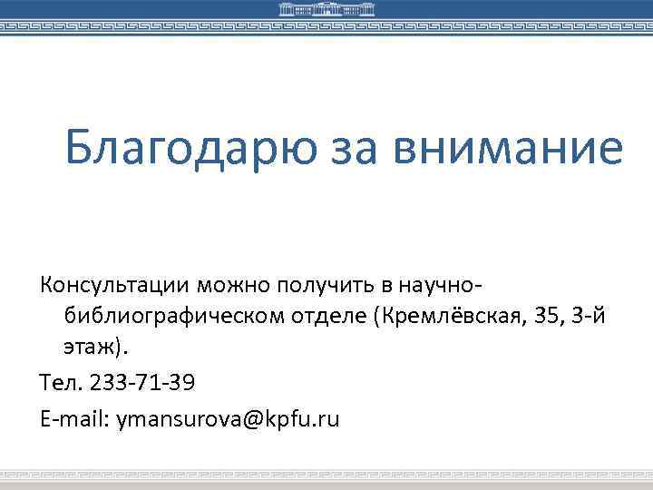 Благодарю за внимание Консультации можно получить в научнобиблиографическом отделе (Кремлёвская, 35, 3 -й этаж). Тел. 233 -71 -39 E-mail: ymansurova@kpfu. ru