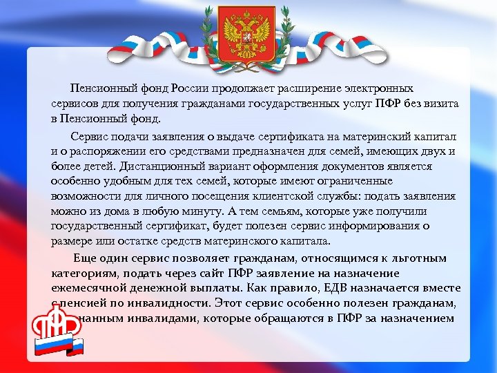 Пенсионный фонд России продолжает расширение электронных сервисов для получения гражданами государственных услуг ПФР без визита в Пенсионный фонд. Сервис подачи заявления о выдаче сертификата на материнский капитал и о распоряжении его средствами предназначен для семей, имеющих двух и более детей. Дистанционный вариант оформления документов является особенно удобным для тех семей, которые имеют ограниченные возможности для личного посещения клиентской службы: подать заявления можно из дома в любую минуту. А тем семьям, которые уже получили государственный сертификат, будет полезен сервис информирования о размере или остатке средств материнского капитала. Еще один сервис позволяет гражданам, относящимся к льготным категориям, подать через сайт ПФР заявление на назначение ежемесячной денежной выплаты. Как правило, ЕДВ назначается вместе с пенсией по инвалидности. Этот сервис особенно полезен гражданам, признанным инвалидами, которые обращаются в ПФР за назначением