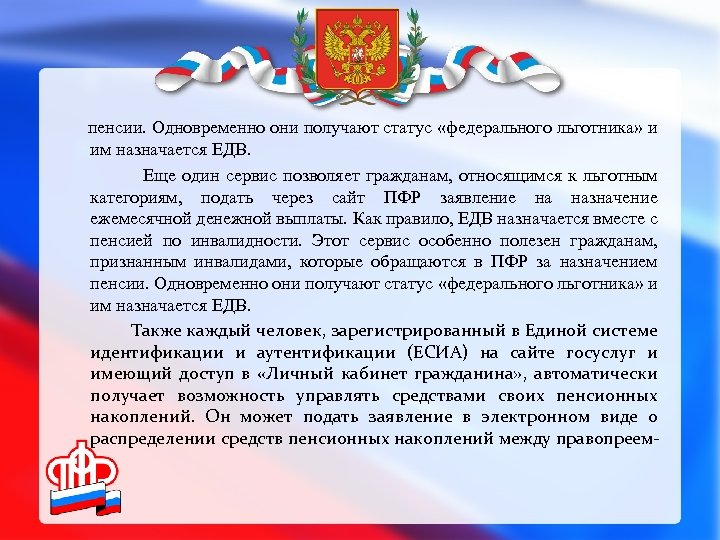 пенсии. Одновременно они получают статус «федерального льготника» и им назначается ЕДВ. Еще один сервис позволяет гражданам, относящимся к льготным категориям, подать через сайт ПФР заявление на назначение ежемесячной денежной выплаты. Как правило, ЕДВ назначается вместе с пенсией по инвалидности. Этот сервис особенно полезен гражданам, признанным инвалидами, которые обращаются в ПФР за назначением пенсии. Одновременно они получают статус «федерального льготника» и им назначается ЕДВ. Также каждый человек, зарегистрированный в Единой системе идентификации и аутентификации (ЕСИА) на сайте госуслуг и имеющий доступ в «Личный кабинет гражданина» , автоматически получает возможность управлять средствами своих пенсионных накоплений. Он может подать заявление в электронном виде о распределении средств пенсионных накоплений между правопреем-