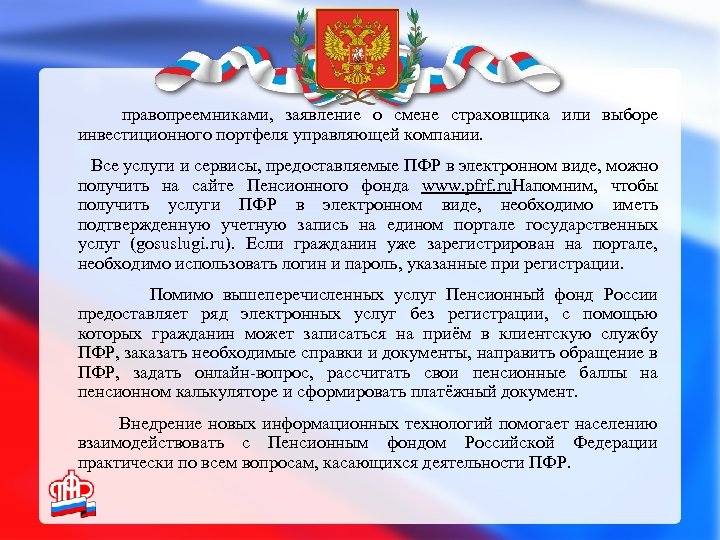 правопреемниками, заявление о смене страховщика или выборе инвестиционного портфеля управляющей компании. Все услуги и сервисы, предоставляемые ПФР в электронном виде, можно получить на сайте Пенсионного фонда www. pfrf. ru. Напомним, чтобы получить услуги ПФР в электронном виде, необходимо иметь подтвержденную учетную запись на едином портале государственных услуг (gosuslugi. ru). Если гражданин уже зарегистрирован на портале, необходимо использовать логин и пароль, указанные при регистрации. Помимо вышеперечисленных услуг Пенсионный фонд России предоставляет ряд электронных услуг без регистрации, с помощью которых гражданин может записаться на приём в клиентскую службу ПФР, заказать необходимые справки и документы, направить обращение в ПФР, задать онлайн-вопрос, рассчитать свои пенсионные баллы на пенсионном калькуляторе и сформировать платёжный документ. Внедрение новых информационных технологий помогает населению взаимодействовать с Пенсионным фондом Российской Федерации практически по всем вопросам, касающихся деятельности ПФР.