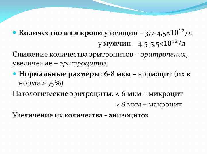 Эритроциты - постклеточная структура крови, основная задача состоит в транспорте кислорода из легких в ткани и двуокиси углерода – обратно в легкие. Нормальная форма: двояковогнутый диск – дискоцит Патологические формы – пойкилоциты: сфероциты, планициты, стоматоциты, эхиноциты, акантоциты и тд. Строение: ядра нет, мембранных органелл нет, из немембранных имеются только микрофиламенты, цитаплазма заполнена гемоглобином. Гемоглобин F – гемоглобин плода. Гемоглобин А – гемоглобин взрослых.