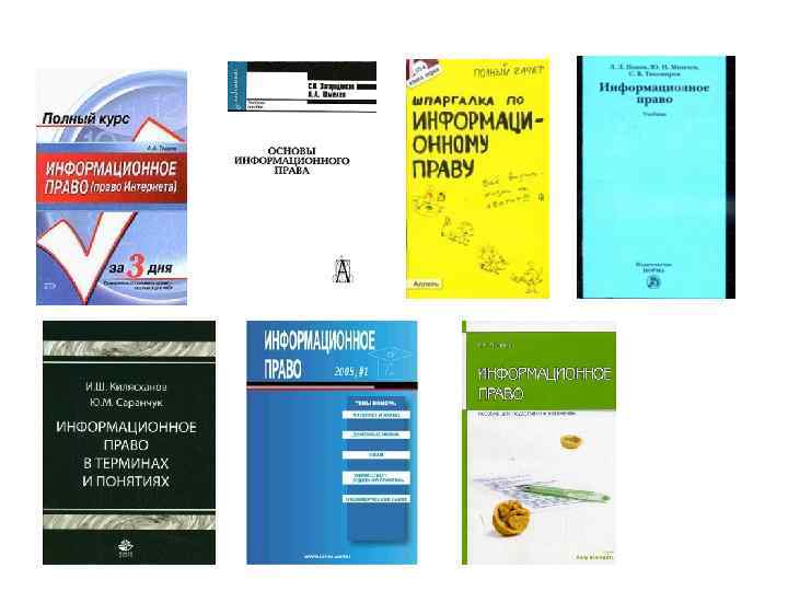 1. ИНФОРМАЦИОННОЕ ПРАВО КАК ОТРАСЛЬ ПРАВА Информационное право комплексная отрасль права, регулирующая общественные отношения в кибер сфере. В литературе информационное право рассматривается в следующих значениях: как наука; как отрасль права; как учебная дисциплина. Наука информационного права исследует нормы, регу лирующие общественные отношения в информационной сфере, измеряет эффективность действия информацион ных норм, классифицирует, систематизирует и кодифици рует их, объединяет в правовые институты, формирует и оптимизирует систему информационного права. Предметом науки информационного права является система информационного права. Информационное право как наука изучает научные проблемы формиро вания и развития этой системы. Исследования в области информационного права находят свое выражение в статьях, монографиях, на конференциях, круглых столах, в Интернете. Информационное право как система норм, регулирующих информационные отношения, имеет целью исследование информационной сферы как сферы правового регулирова ния общественных отношений, выявление объектов и субъек тов информационных правоотношений, подготовку проектов нормативных правовых актов в области действия информа ционного права, оценку эффективности проектов этих актов с применением информационных технологий. Основные задачи в этой области: изучение актов действующего информационного законодательства и подзаконных актов; выявление пробелов и дублей. в источниках информационного права, разработка предложений по разработке проектов федеральных законов и подзаконных актов в этой области; изучение практики применения норм и актов инфор мационного права, оценка эффективности действия принятых нормативных правовых актов, подготовка предложений по совершенствованию процессов регулирования общественных отношений в информационной сфере, предложений по дополнению и изменению норм и актов информационного права; проведение работ по подготовке законопроектов и иных нормативных правовых актов в информационной сфере; изучение проблем формирования Информационного кодекса РФ как основного кодифицированного акта информационного права. Информационное право как учебная дисциплина имеет целью обучение студентов, аспирантов, других слушателей в области информационного права.