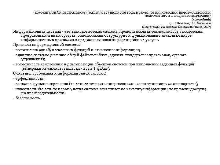 "КОММЕНТАРИЙ К ФЕДЕРАЛЬНОМУ ЗАКОНУ ОТ 27 ИЮЛЯ 2006 ГОДА N 149 ФЗ "ОБ ИНФОРМАЦИИ, ИНФОРМАЦИОННЫХ ТЕХНОЛОГИЯХ И О ЗАЩИТЕ ИНФОРМАЦИИ" (постатейный) (Н. Н. Ковалева, Е. В. Холодная) (Подготовлен для системы Консультант. Плюс, 2007) Информационная система это технологическая система, представляющая совместимость технических, программных и иных средств, объединяющих структурно и функционально несколько видов информационных процессов и предоставляющая информационные услуги. Признаки информационной системы: выполнение одной, нескольких функций в отношении информации; единство системы (наличие общей файловой базы, единых стандартов и протоколов, единого управления); возможность композиции и декомпозиции объектов системы при выполнении заданных функций (выдержки из законов, закладки все в 1 файле). Основные требования к информационной системе: эффективность; качество функционирования (то есть ее точность, защищенность, согласованность со стандартами); надежность (то есть те пороги, когда система отказывает по качеству информации; по времени доступа; по производительности; безопасность.