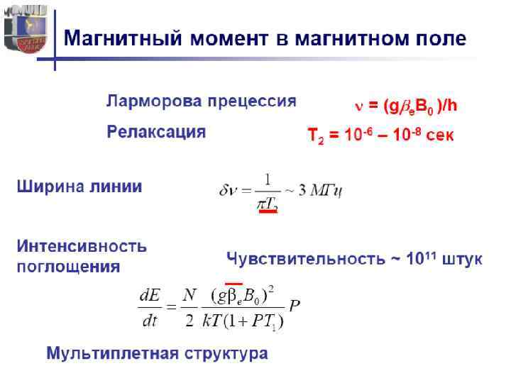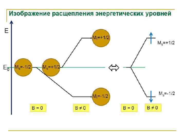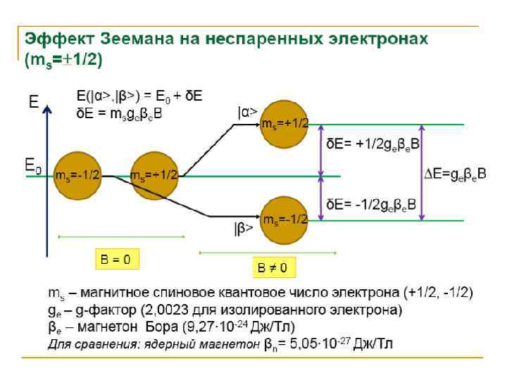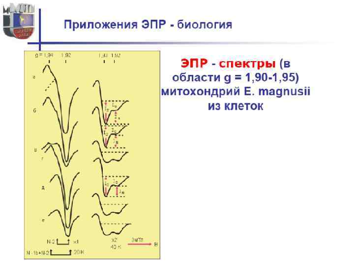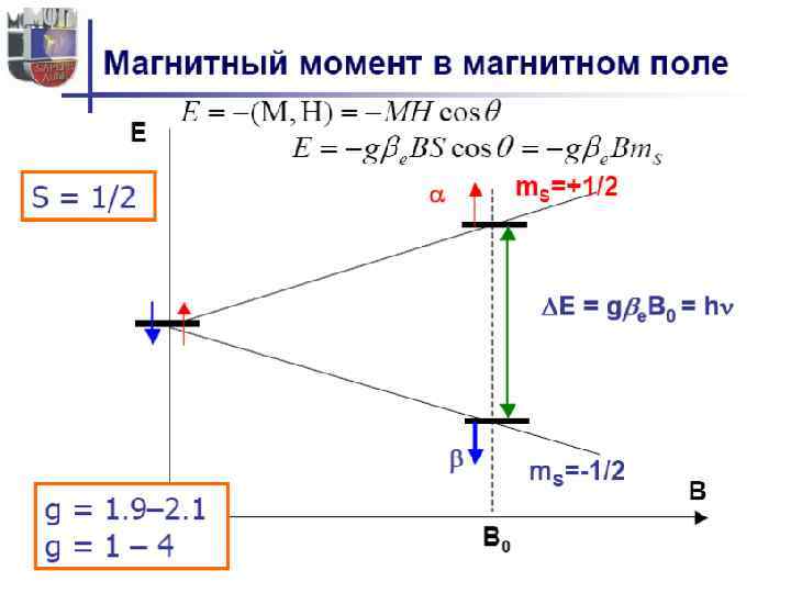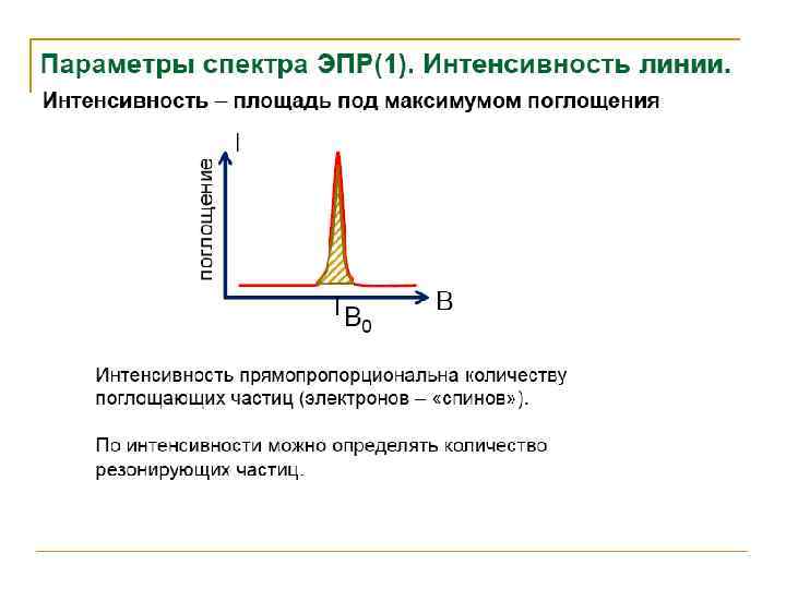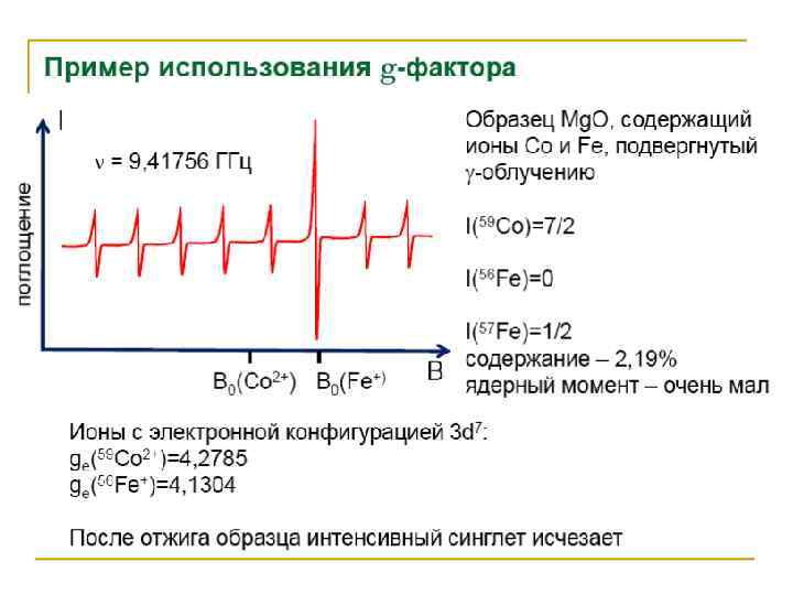 • Для твердых образцов наиболее перспективно использование монокристаллов, однако из-за трудности их получения чаще работают с замороженными растворами (стеклами) или с монокристаллическим порошками. • Для снижения спин-спинового взаимодействия часто используют совместную кристаллизацию парамагнитного вещества с диамагнитным, образующими с ним изоморфные кристаллы. • Симметричная линия поглощения ЭПР характеризуется ее положением в магнитном поле, интенсивностью, шириной и формой. Положение линии в магнитном поле определяется g-фактором, являющимся мерой эффективного магнитного момента электрона. • Величина g-фактора − индивидуальное свойство каждого вещества. Угол расхождения энергетических уровней при увеличении магнитных полей зависит от gфактора, и для различных веществ он разный, что позволяет проводить идентификацию и обнаружение вещества.