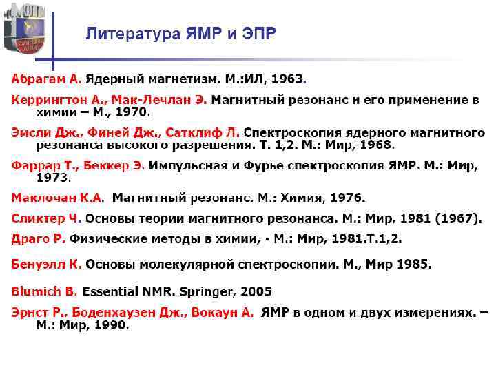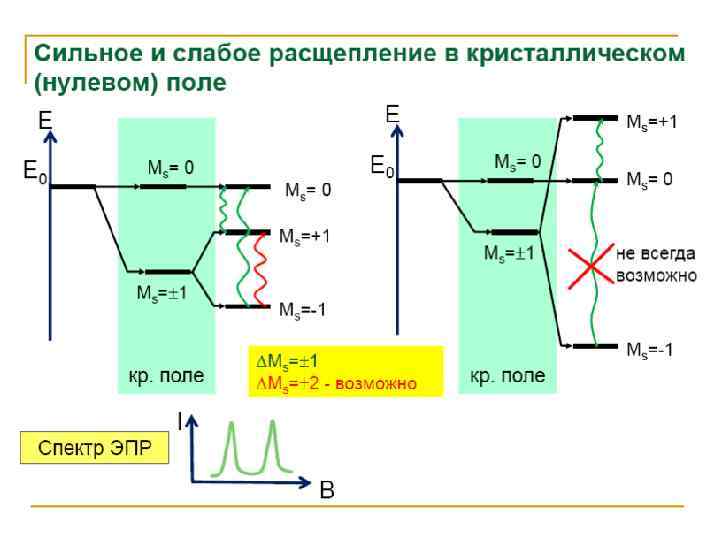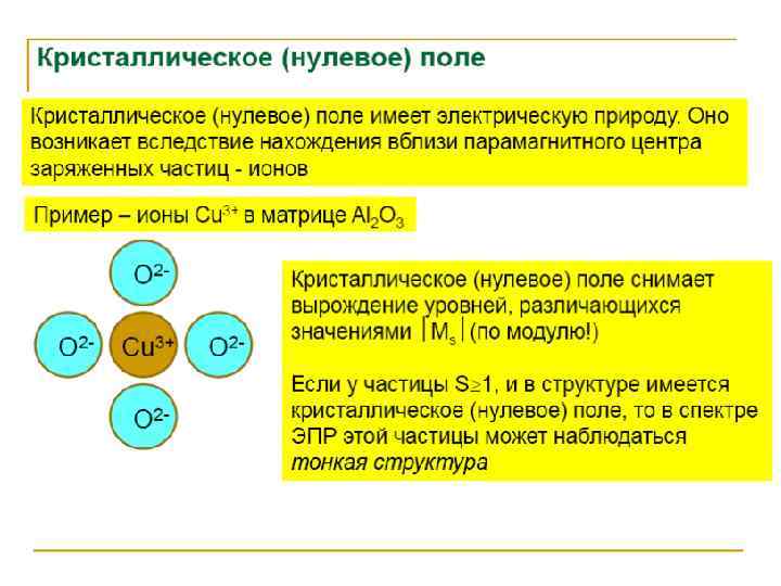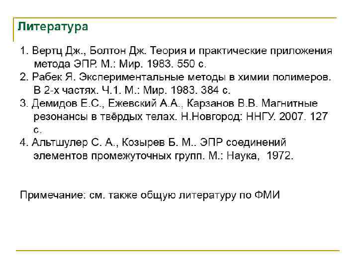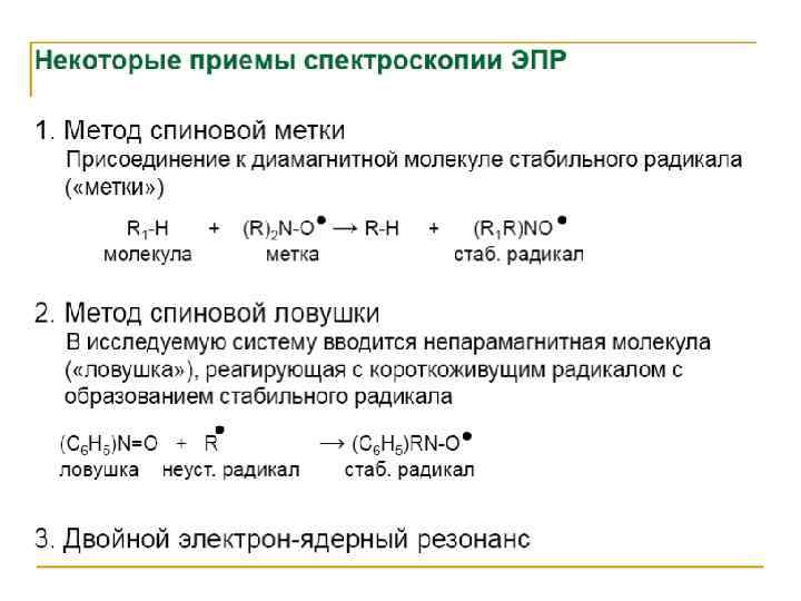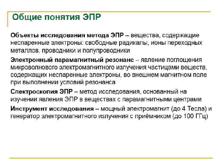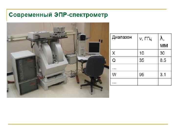 Электронный парамагнитный резонанс (ЭПР) • Сигнал ЭПР наблюдается для веществ, в атомах или молекулах которых имеются неспаренные электроны. К ним относятся: 1) органические и неорганические свободные радикалы; 2) ионы с частично заполненными внутренними уровнями (3 dи 4 d- переходные элементы и некоторые 4 f-элементы); 3) атомы и молекулы с нечетным числом электронов, например атомы водорода, азота, молекулы NO, Cl. O 2 и др. ; 4) кристаллы, имеющие центры окраски; 5) для металлов и полупроводников, имеющих электроны проводимости. • В химическом анализе чаще всего имеют дело с первыми двумя группами веществ. ЭПР-исследования проводят с жидкими и твердыми образцами и реже с газообразными. При работе с жидкими образцами целесообразнее использовать неполярные органические растворители, т. к. увеличение диэлектрической проницаемости приводит к ухудшению аналитического сигнала.