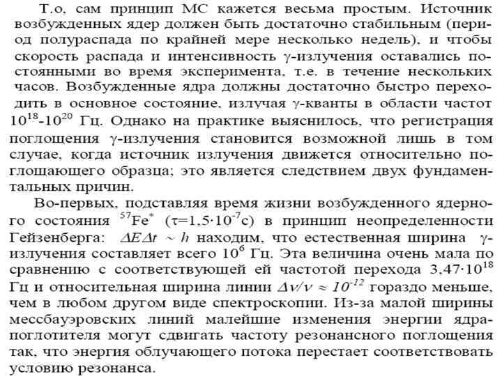 • Т. к время жизни возбужденного ядерного состояния 57 Fe* (около 1, 5· 10 -7 с) значительно меньше, чем 270 сут, то фактически при каждом распаде ядер 57 Со испускается γ-квант. Поглотителем (образцом) может быть обычное железо в любом химическом состоянии, поскольку распространенность 57 Fe в природе составляет ~2%, что оказывается достаточным для получения приемлемой чувствительности.