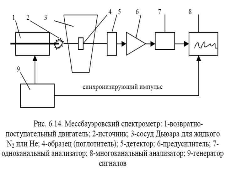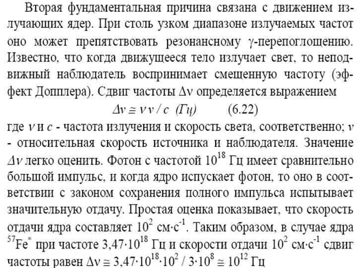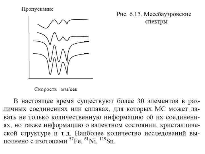 Мессбауэровская спектроскопия • Мессбауэровская спектроскопия (МС) напоминает оптическую резонансную флуоресценцию с той разницей, что вызвана она переходами между ядерными, а не атомными энергетическими уровнями. • При радиоактивном распаде достаточно тяжелых элементов большая часть образующихся атомов возникает вначале в возбужденном ядерном состоянии. Через несколько микросекунд возвращается в исходное (основное) состояние, испуская излучение очень высокой частоты (10181020 Гц), лежащей в области γ-спектра. • С помощью мессбауэровской спектроскопии наиболее часто определяют железо или олово вследствие оптимального взаимного расположения ядерных энергетических уровней в их изотопах. Так, например, изотоп 57 Fe обычно получают при радиоактивном распаде 57 Со (период полураспада около 270 сут). Из схемы видно (рис. 6. 13), что в результате захвата электрона ядро кобальта образует возбужденное ядро железа 57 Fe *. Переход между этими уровнями дает γизлучение, которое легко поглощается ядрами железа, находящимися в основном состоянии.