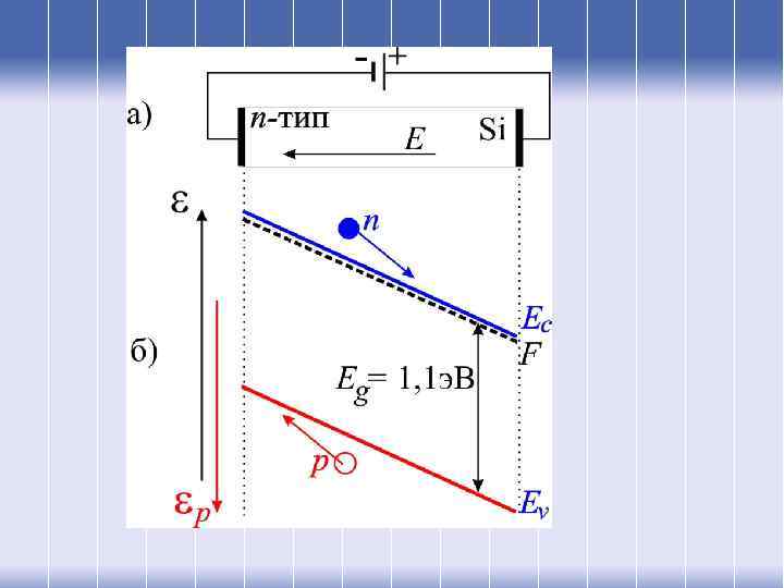 Важно подчеркнуть, что внешнее напряжение может только выпрямить границы разрешенных зон. Другими словами, приложении больших прямых смещений электроны начнут «убегать» от батареи смещения и все зоны будут наклоняться.