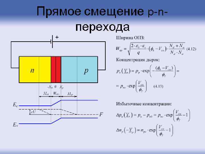 Рассмотрим теперь pn-переход, к которому приложено прямое смещение Vсм (минус батареи к n-типу, плюс – к p-типу). Допустим, что все приложенное внешнее напряжение падает на pn-переходе. При прямом смещении высота потенциального барьера понижается на q. Vсм по сравнению с равновесным состоянием, соответственно изменяется и толщина ОПЗ: