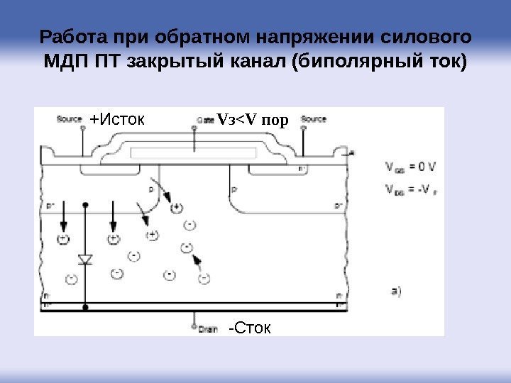 Работа при обратном напряжении силового МДП ПТ закрытый канал (биполярный ток) V з <V пор +Исток -Сток