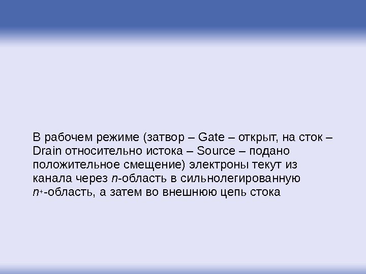В рабочем режиме (затвор – Gate – открыт, на сток – Drain относительно истока – Source – подано положительное смещение) электроны текут из канала через n -область в сильнолегированную n+ -область, а затем во внешнюю цепь стока