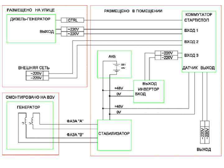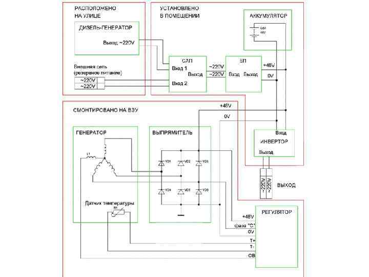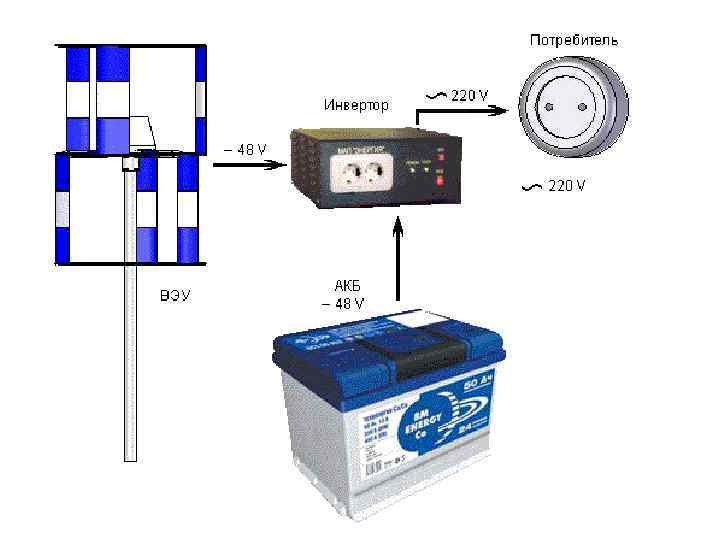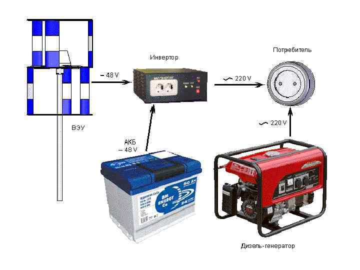 Базовая схема включает в себя ВЭУ, инвертор, батареи, дизель-генератор. Схема может использовать двойное преобразование от дизель-генератора и сети (переменный – постоянный – переменный ток) для подачи бесперебойного питания потребителю. В этом случае потребитель не чувствует даже малейших перепадов в питании при переключении с одного источника питания на другой (например, с ветроустановки на дизель-генератор и т. д. ).