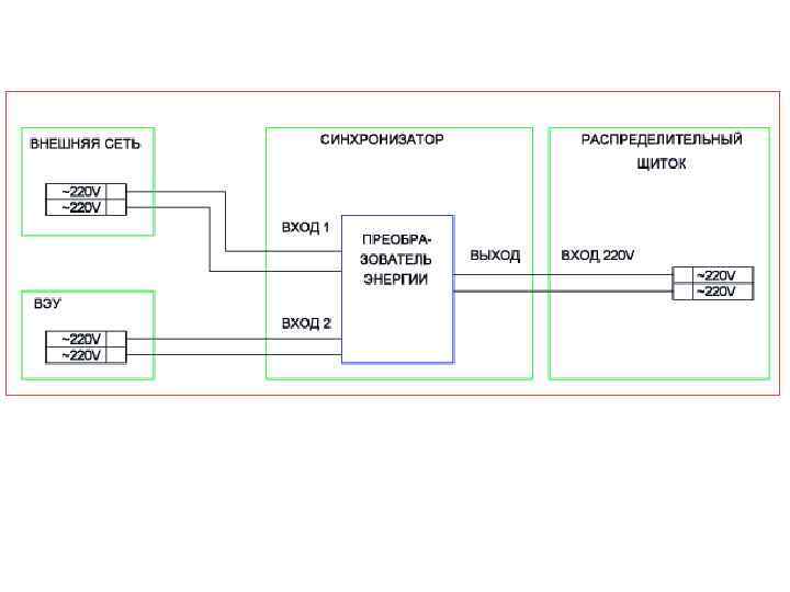 Преимущества: - Переключение не требует присутствия человека, - Нет перебоев в энергоснабжении, Недостатки: - Система дорогая, т. к. требуется дополнительный прибор (стоимость синхронизатора составляет около 25000 рублей за киловатт). - Максимальная потребляемая мощность не может быть больше номинальной мощности синхронизатора и/или инвертора. Например, если номинал инвертора 3 к. Вт, а номинал синхронизатора 4 к. Вт то потребляемая мощность от ВЭУ не может превышать 3 к. Вт, а от сети - 4 к. Вт.