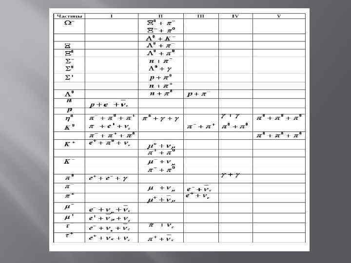 Элементар бөлшектердің топтастырылуы. Элементар бөлшектерді әдетте төрт топқа бөледі. Бірінші топты әсерлесуді тасымалдаушылар құрайды. Екінші топты лептондар, үшінші – мезондар және төртінші – бариондар құрайды. өзара әеркеттерді тасымалдаушылар Лептондар адрондар мезондар бариондар нуклондар γ, , Zo, глюондар е, μ, τ, νе, νμ , ν τ π, κ, η және резонанстар гиперондар p, n Λ, Σ, Ξ, Ωжәне резонанстар