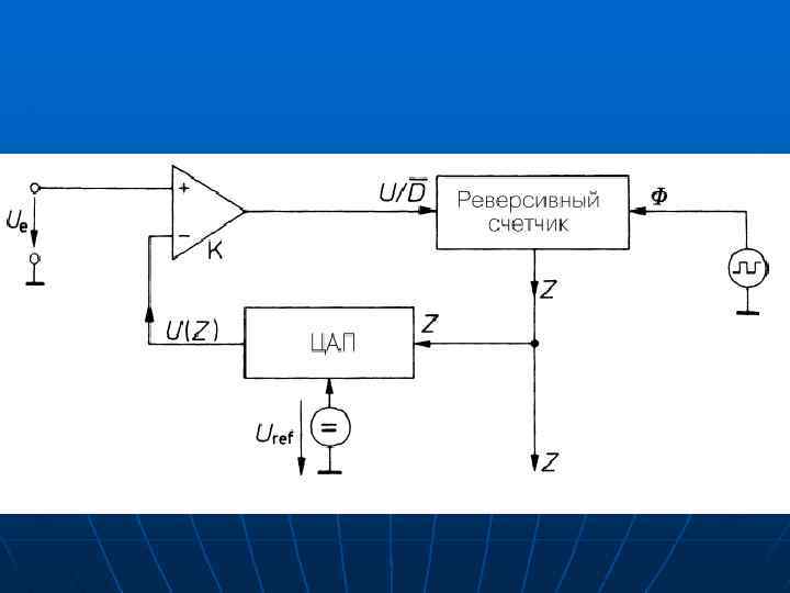 АЦП последовательного приближения или АЦП с поразрядным уравновешиванием содержит компаратор, вспомогательный ЦАП и регистр последовательного приближения. n АЦП преобразует аналоговый сигнал в цифровой за N шагов, где N — разрядность АЦП. На каждом шаге определяется по одному биту искомого цифрового значения, начиная от СЗР и заканчивая МЗР. n Последовательность действий: На вспомогательном ЦАП выставляется аналоговое значение, образованное из битов, уже определённых на предыдущих шагах; бит, который должен быть определён на этом шаге, выставляется в 1, более младшие биты установлены в 0. Полученное на вспомогательном ЦАП значение сравнивается с входным аналоговым значением. Если значение входного сигнала больше значения на вспомогательном ЦАП, то определяемый бит получает значение 1, в противном случае 0.