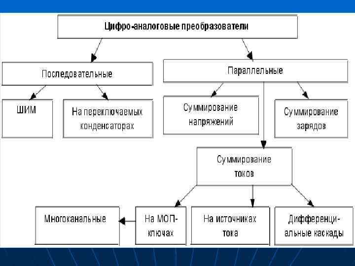 Кроме этого ИМС цифро-аналоговых преобразователей классифицируются по следующим признакам: n По виду выходного сигнала: с токовым выходом и выходом в виде напряжения n По типу цифрового интерфейса: с последовательным вводом и с параллельным вводом входного кода n По числу ЦАП на кристалле: одноканальные и многоканальные n По быстродействию: умеренного и высокого быстродействия