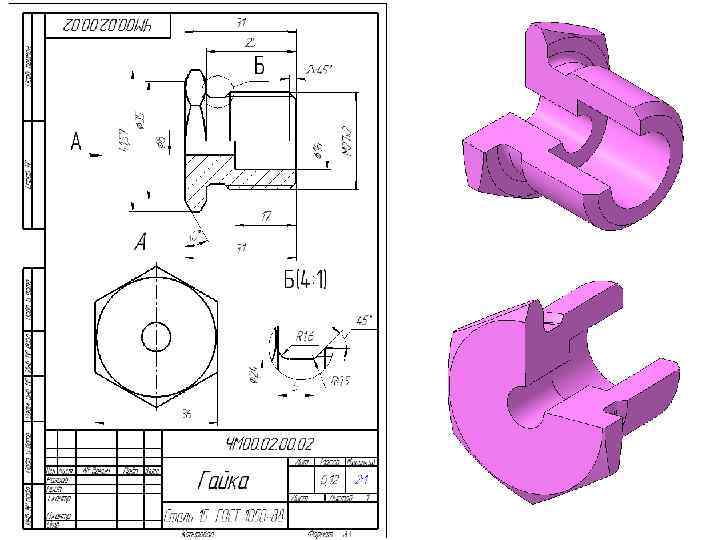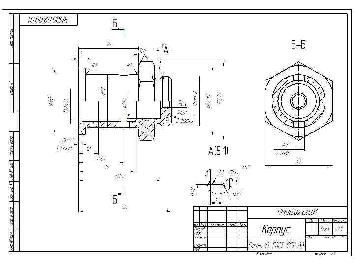 11. Нанести выносные и размерные линии. При этом рекомендуется размеры внешних элементов наносить со стороны вида, а внутренних – со стороны разреза, согласуя размеры детали с размерами сопрягаемых элементов. 12. Нанести с учетом масштаба изображения размерные числа, которые Вы получили замером линейных величин на чертеже общего вида. 13. Проставить стандартные размеры на стандартные элементы детали (диаметры резьбы, фаски, проточки, шпоночные пазы, размеры «под ключ» и др. ).