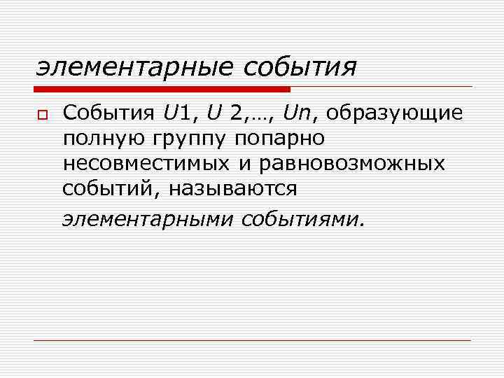 элементарные события o События U 1, U 2, …, Un, образующие полную группу попарно несовместимых и равновозможных событий, называются элементарными событиями.