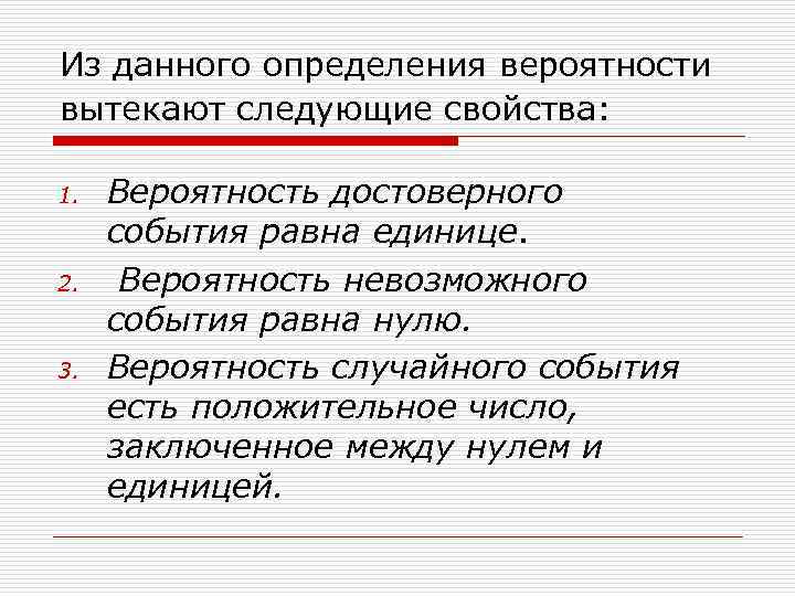 Из данного определения вероятности вытекают следующие свойства: 1. 2. 3. Вероятность достоверного события равна единице. Вероятность невозможного события равна нулю. Вероятность случайного события есть положительное число, заключенное между нулем и единицей.