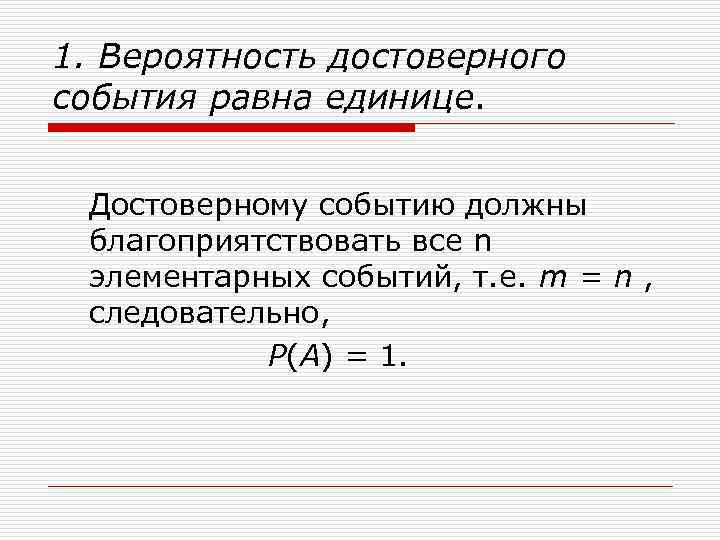 1. Вероятность достоверного события равна единице. Достоверному событию должны благоприятствовать все n элементарных событий, т. е. m = n , следовательно, P(A) = 1.