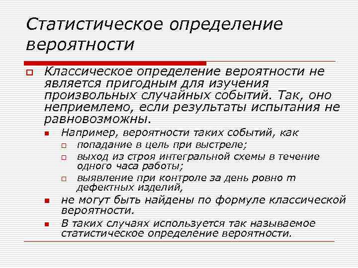 Статистическое определение вероятности o Классическое определение вероятности не является пригодным для изучения произвольных случайных событий. Так, оно неприемлемо, если результаты испытания не равновозможны. n n n Например, вероятности таких событий, как o попадание в цель при выстреле; o выход из строя интегральной схемы в течение одного часа работы; o выявление при контроле за день ровно m дефектных изделий, не могут быть найдены по формуле классической вероятности. В таких случаях используется так называемое статистическое определение вероятности.
