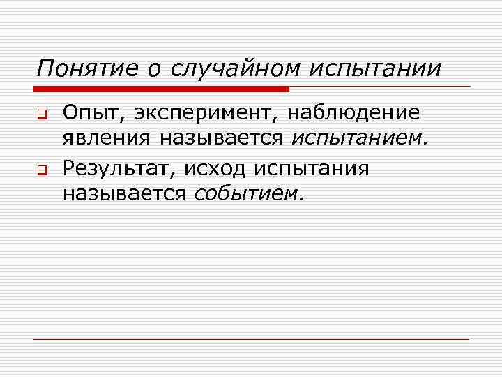 Понятие о случайном испытании q q Опыт, эксперимент, наблюдение явления называется испытанием. Результат, исход испытания называется событием.