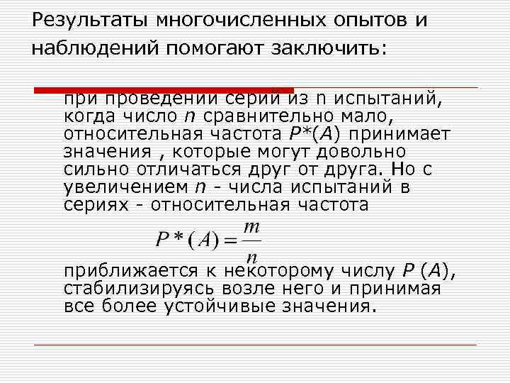 Результаты многочисленных опытов и наблюдений помогают заключить: при проведении серий из n испытаний, когда число n сравнительно мало, относительная частота Р*(А) принимает значения , которые могут довольно сильно отличаться друг от друга. Но с увеличением n - числа испытаний в сериях - относительная частота приближается к некоторому числу Р (А), стабилизируясь возле него и принимая все более устойчивые значения.
