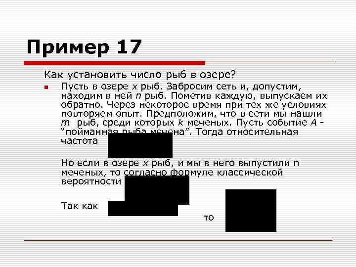 Пример 17 Как установить число рыб в озере? n Пусть в озере x рыб. Забросим сеть и, допустим, находим в ней n рыб. Пометив каждую, выпускаем их обратно. Через некоторое время при тех же условиях повторяем опыт. Предположим, что в сети мы нашли m рыб, среди которых k меченых. Пусть событие А “пойманная рыба мечена”. Тогда относительная частота Но если в озере x рыб, и мы в него выпустили n меченых, то согласно формуле классической вероятности Так как то