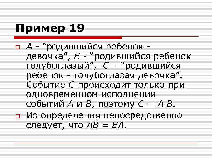 Пример 19 o o А - “родившийся ребенок девочка”, В - “родившийся ребенок голубоглазый”, С – “родившийся ребенок - голубоглазая девочка”. Событие С происходит только при одновременном исполнении событий А и В, поэтому С = А В. Из определения непосредственно следует, что АВ = ВА.