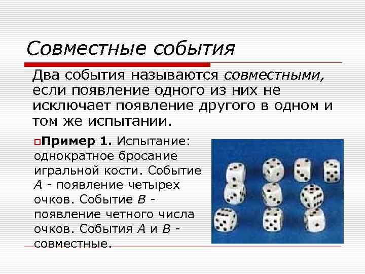 Совместные события Два события называются совместными, если появление одного из них не исключает появление другого в одном и том же испытании. o. Пример 1. Испытание: однократное бросание игральной кости. Событие А - появление четырех очков. Событие В появление четного числа очков. События А и В совместные.
