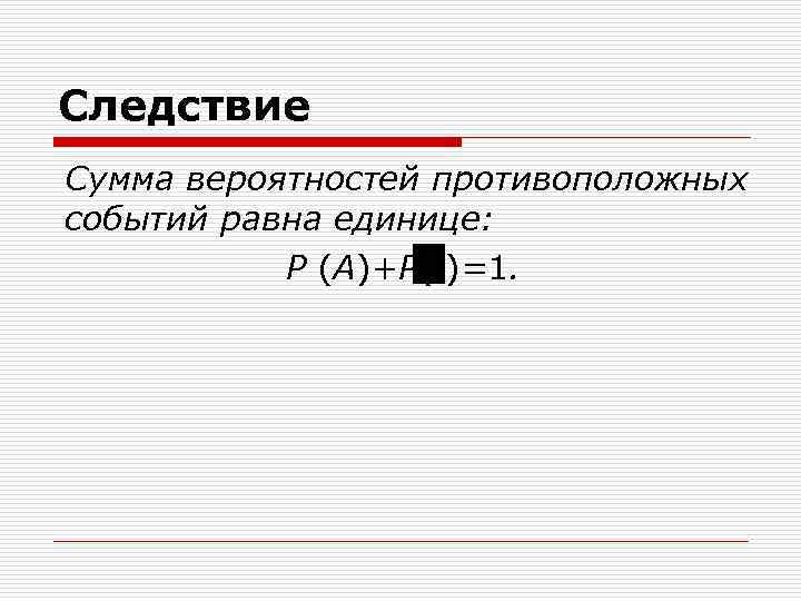 Следствие Сумма вероятностей противоположных событий равна единице: Р (А)+Р( )=1.