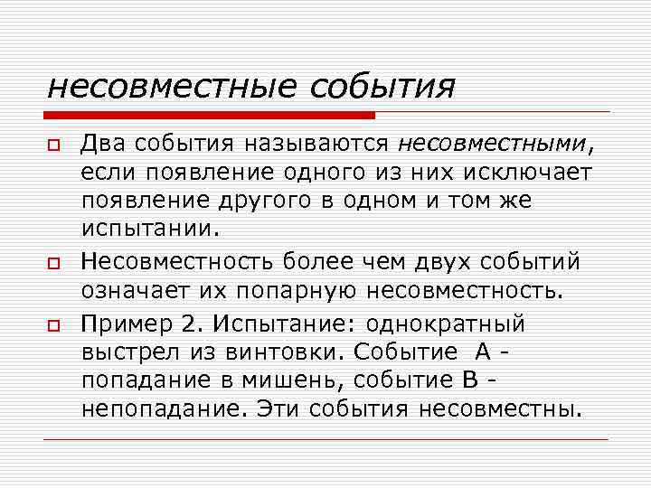 несовместные события o o o Два события называются несовместными, если появление одного из них исключает появление другого в одном и том же испытании. Несовместность более чем двух событий означает их попарную несовместность. Пример 2. Испытание: однократный выстрел из винтовки. Событие А попадание в мишень, событие В непопадание. Эти события несовместны.