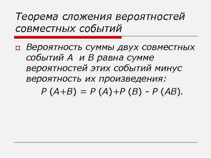 Теорема сложения вероятностей совместных событий o Вероятность суммы двух совместных событий А и В равна сумме вероятностей этих событий минус вероятность их произведения: Р (А+В) = Р (А)+Р (В) - Р (АВ).