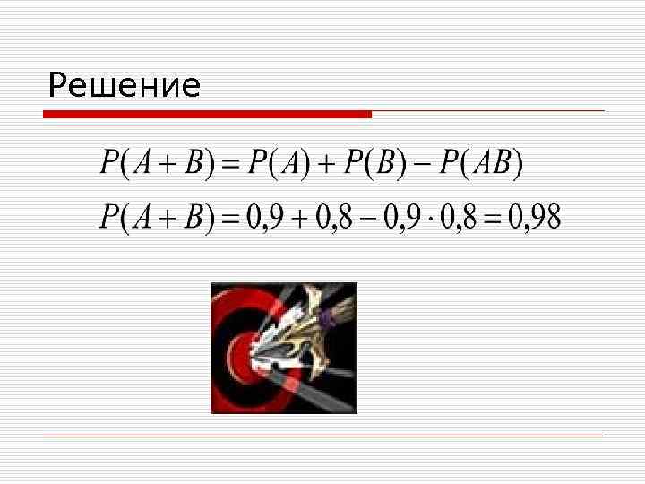 Пример 23 Два стрелка одновременно и независимо друг от друга стреляют по одной мишени. Какова вероятность того, что мишень будет поражена, если вероятность попадания одного стрелка 0. 9, а второго 0. 8?